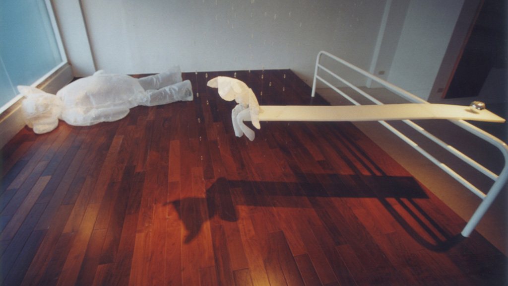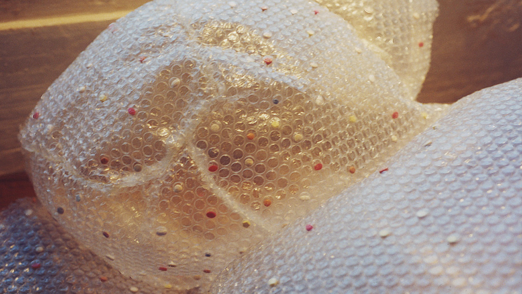 Installation objects and figures composed from plastic wrap, bubble wrap, drug capsules, pills, tracing paper, found objects, toys.