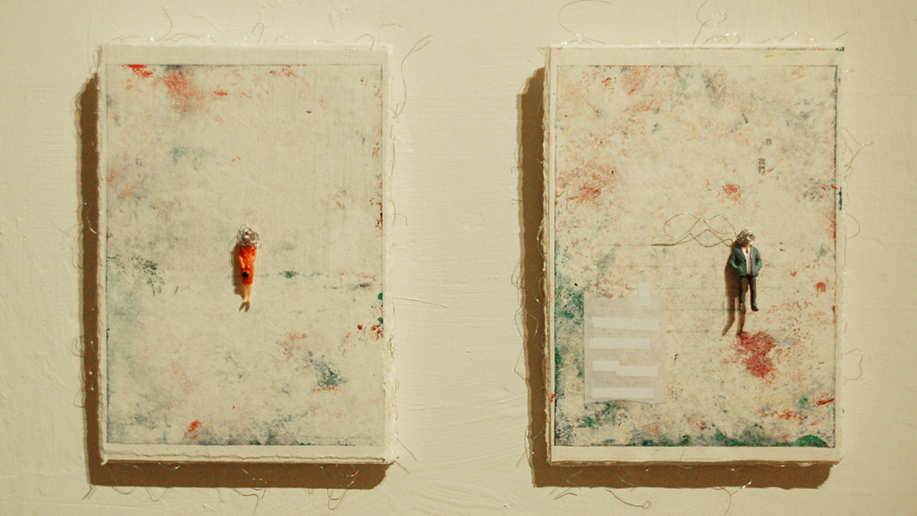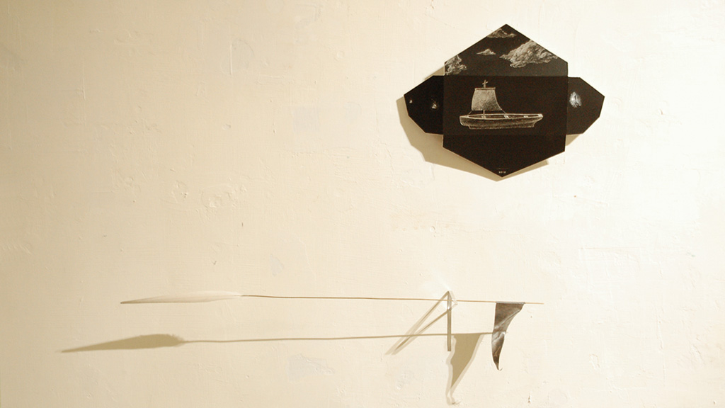 The installation at Masion Balanche consists of seven primary works expressed in various media; from collage and found objects to pencil on paper drawings.