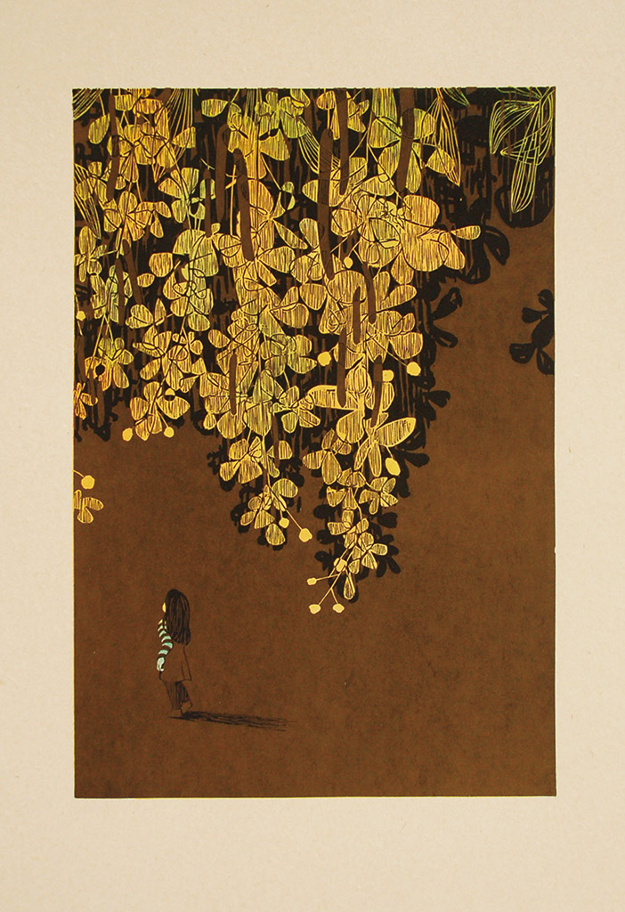 「安靜的煙火」來自作家愛亞老師的書名,在這本書中,她透過描寫許多日常生活中難以置信的豐富花樹植物,串連起一則則源自環境與自然、情感與關懷的內容。在這個創作系列中,我試著延伸作者對於自然環境的關注與感受,用版畫創作台灣花樹主題的同名展覽。